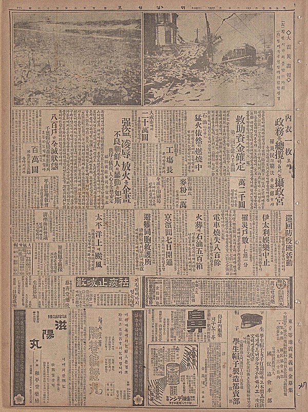 즉시, 이 노동조합 중 하나는 "사회주의 소굴"로 선언되었고 조선인은 무장봉기를 준비하는 살인자, 강간범 및 테러리스트로 선언되었습니다. 수많은 일본 목격자들의 보고에 있다면서 9월 2일부터 요코하마와 도쿄 경찰은 조선인들이 일본군을 공격하고 집을 불태우고 우물에 독을 넣는다는 등의 소문을 퍼뜨리기 시작했습니다.